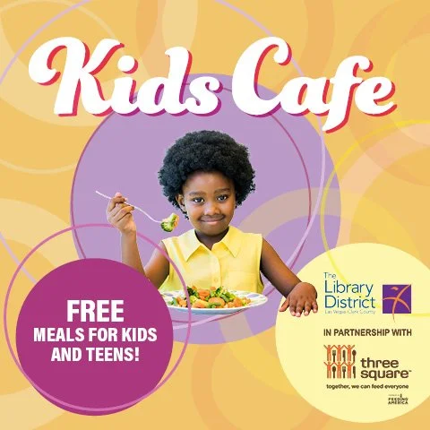 Free meals are available in the Youth Services area for ages 2-18, while supplies last. Meals must be eaten in the library, and children must be present to receive them. Food is supplied by Three Square Food Bank on a first-come, first-served basis.